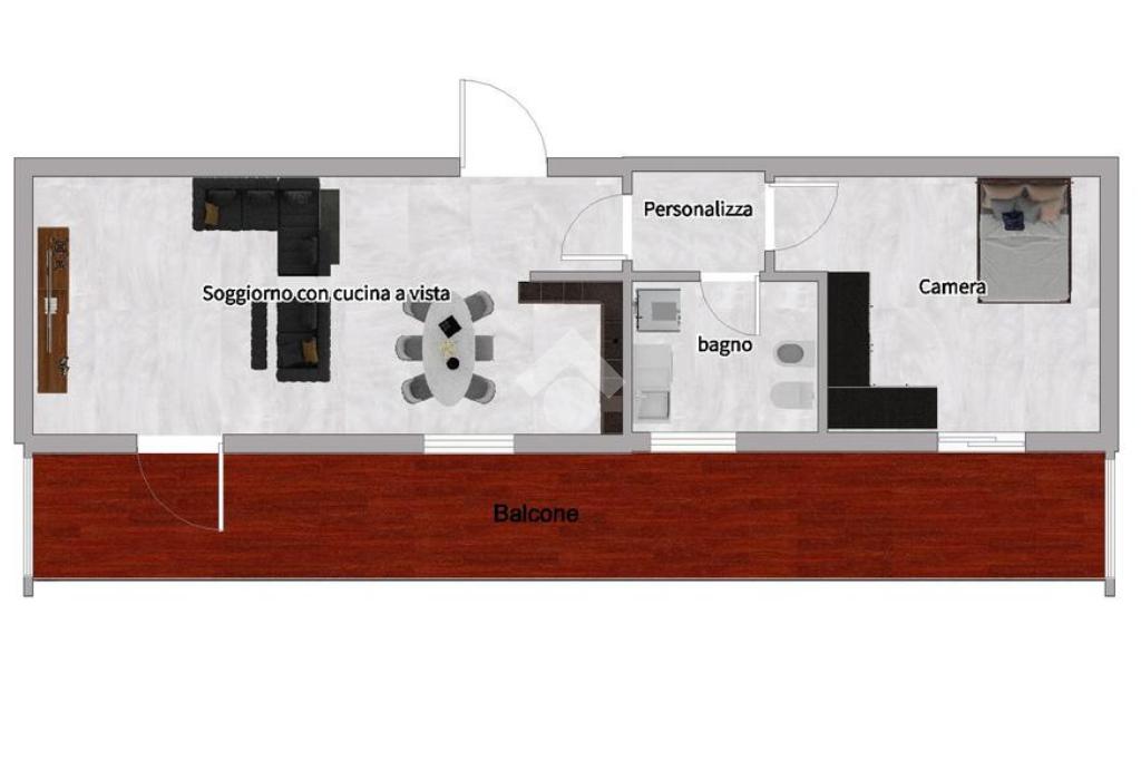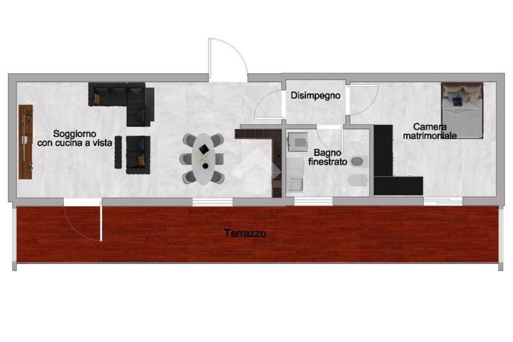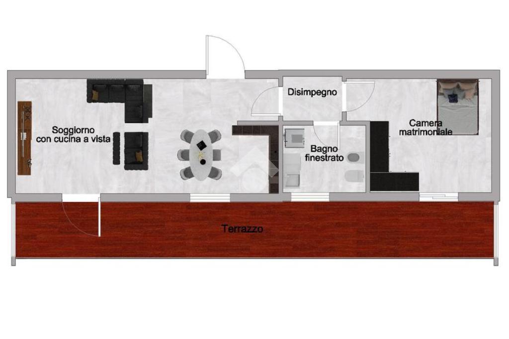 L'immobile, di 58 mq, offre un'accogliente zona giorno con accesso diretto a un ampio terrazzo di 20 mq, ideale per momenti di relax all'aperto. La camera da letto, anch'essa collegata al terrazzo, è caratterizzata da un elegante pavimento in parquet in ottime condizioni. Il bagno, dotato di finestra, garantisce luminosità e ventilazione naturale.
