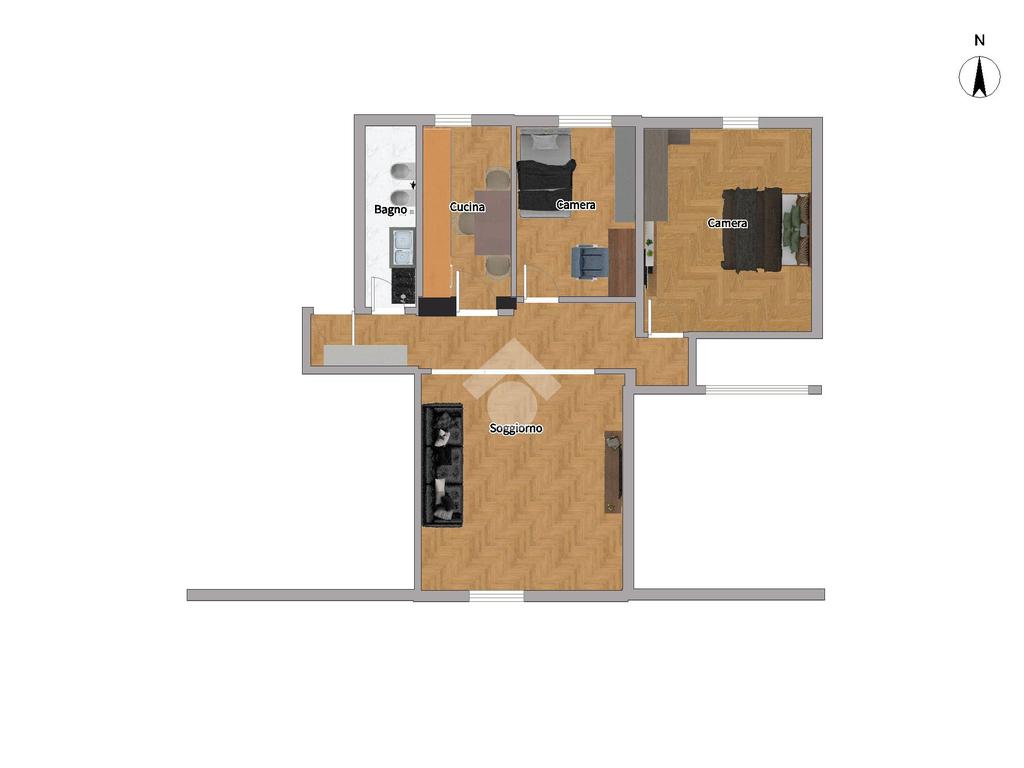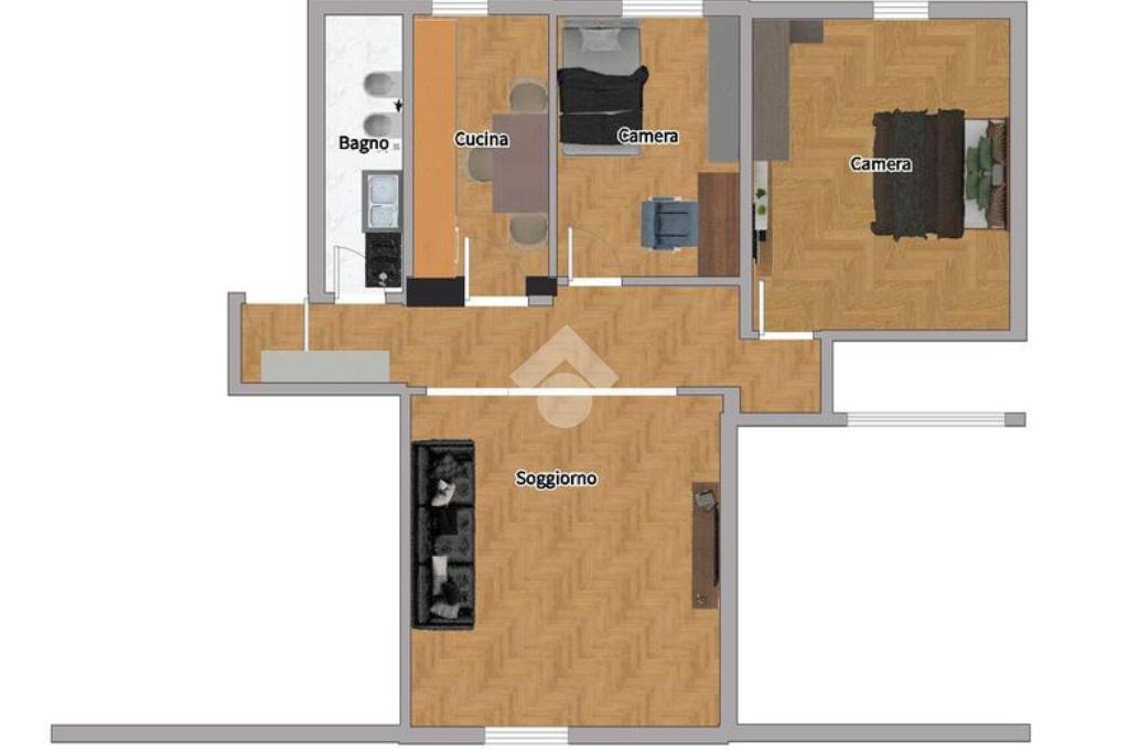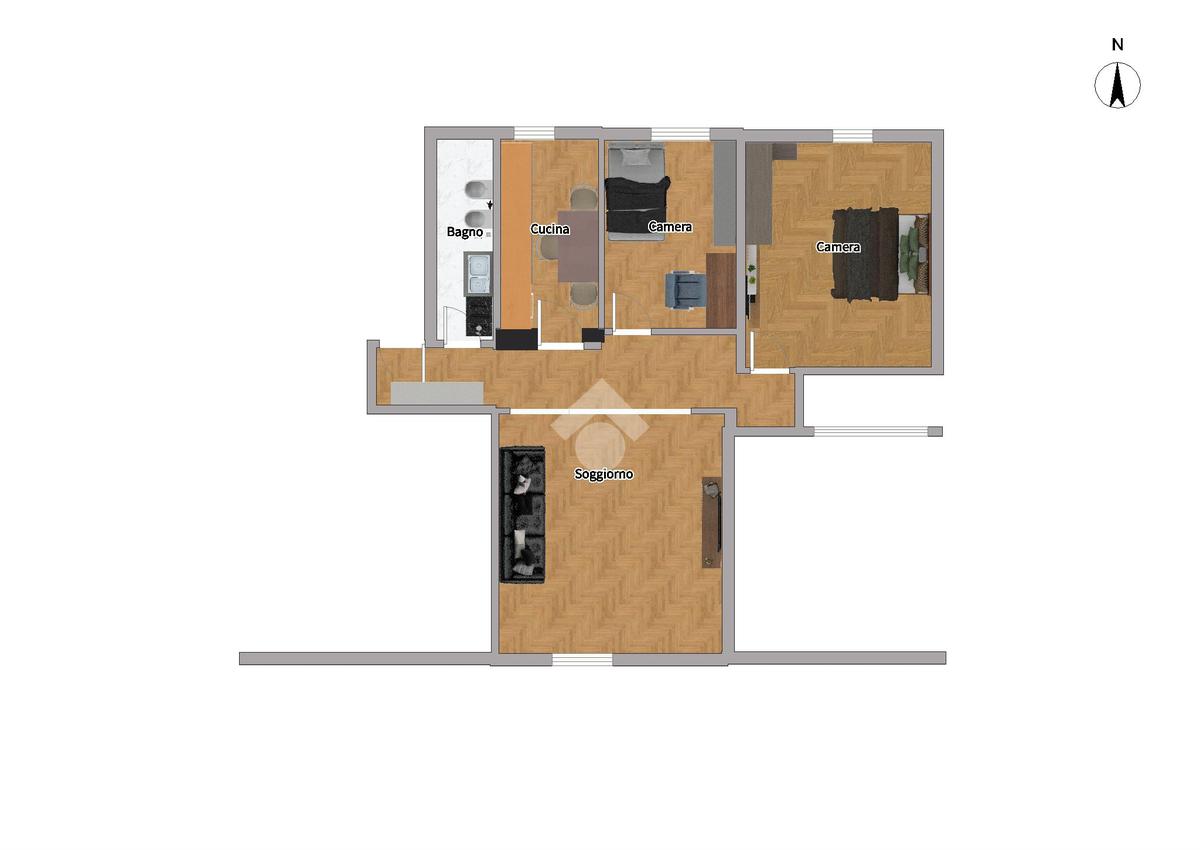 L’immobile si compone di un ampio soggiorno, cucina abitabile con balcone, bagno finestrato, due camere da letto (una con secondo balcone), cantina e solaio. Esposizione interna sul cortile condominiale, ideale per chi cerca tranquillità.