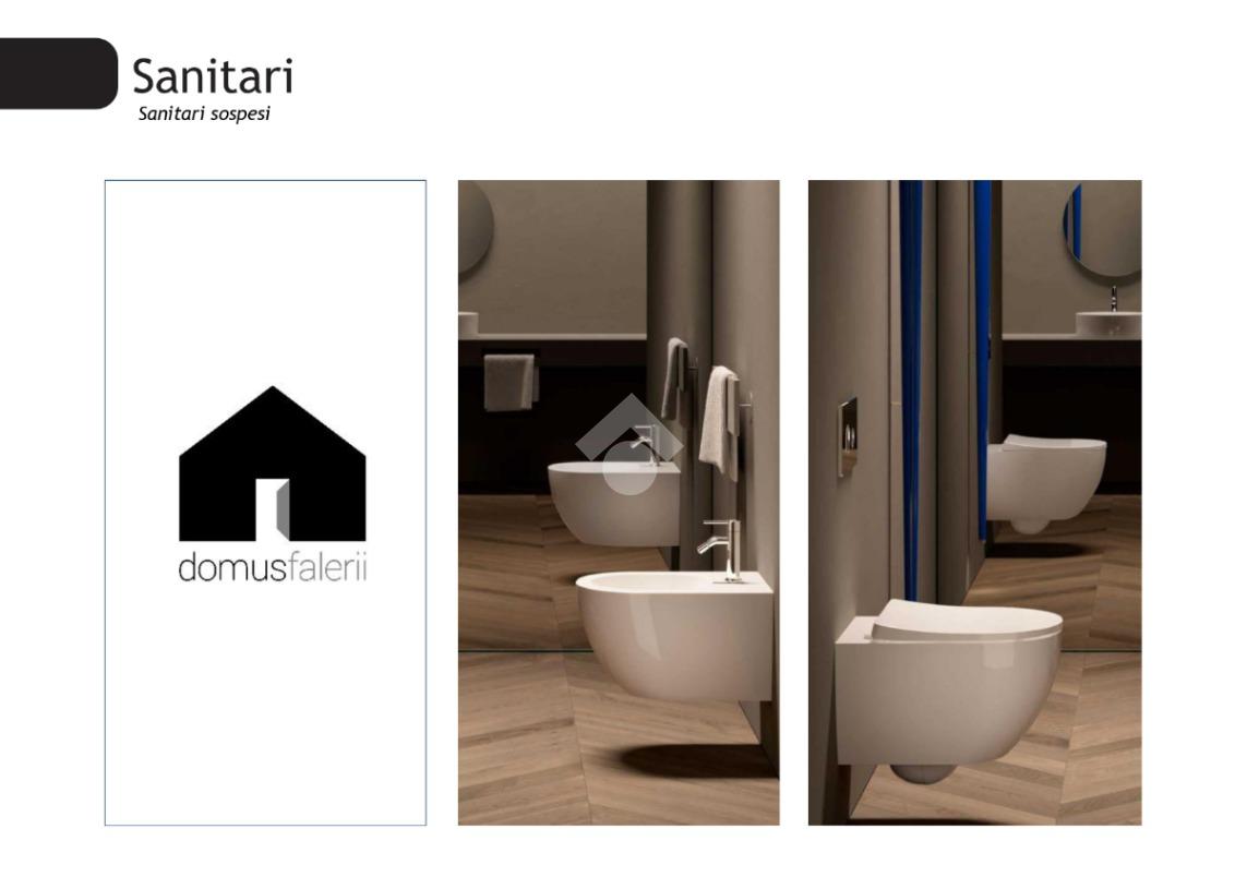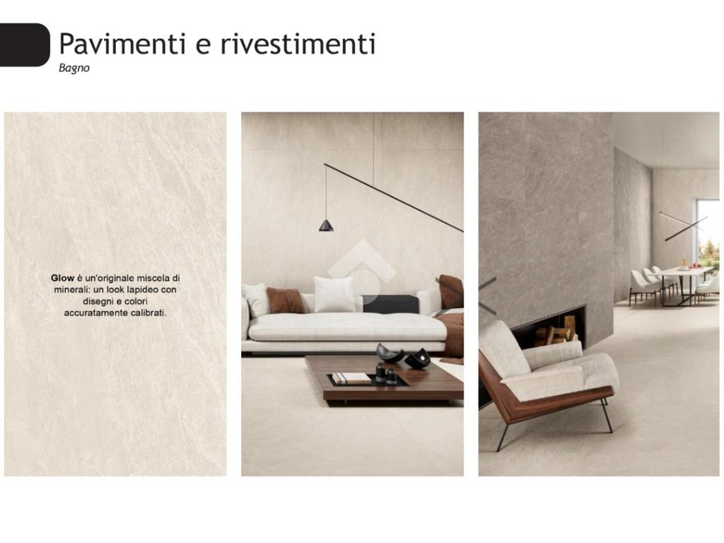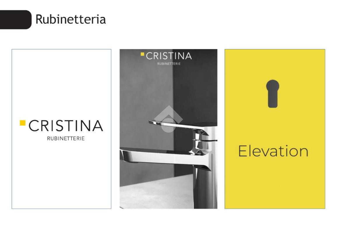4. Bagno in ceramica con grandi formati rifinito con un intonaco liscio e uniforme. Sanitari sospesi. Fornitura e posa di uno scaldasalviette elettrico. Rubinetterie Cristina Elevation.