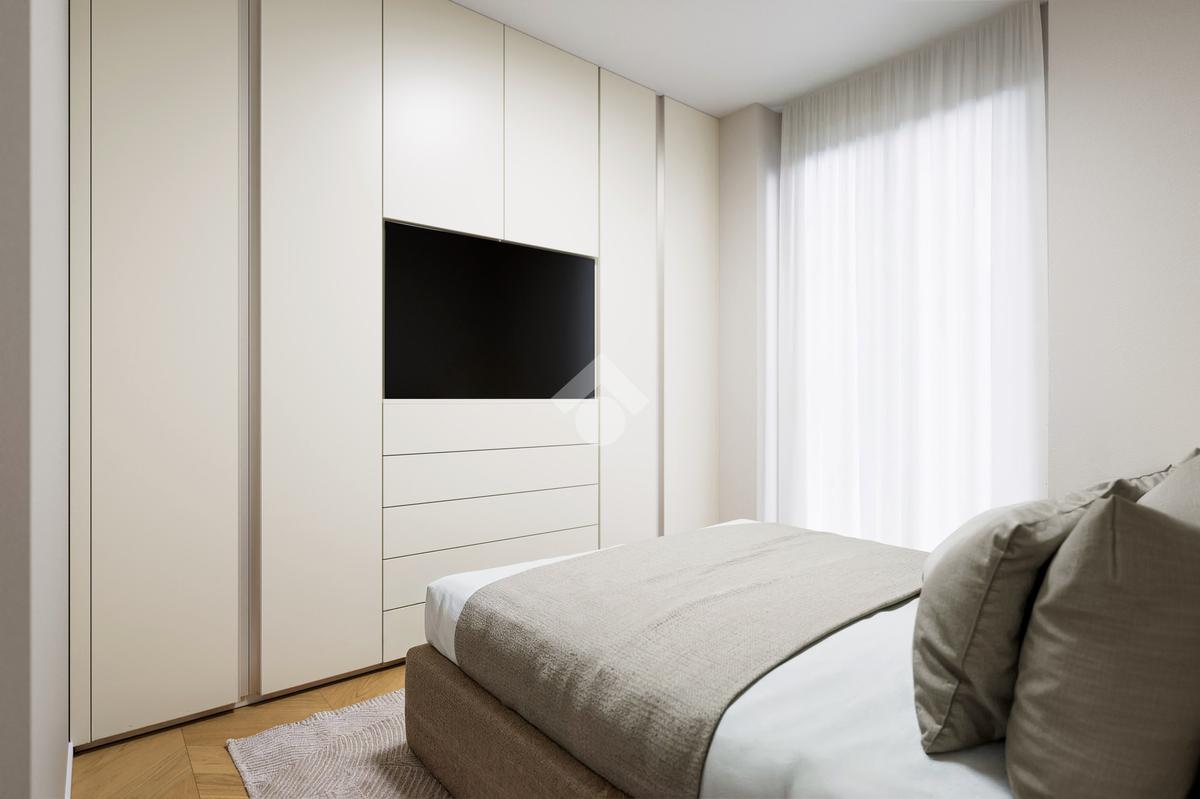Camera matrimoniale e cameretta con armadiature su misura a tutta altezza e finiture di pregio.