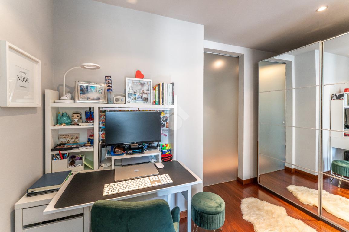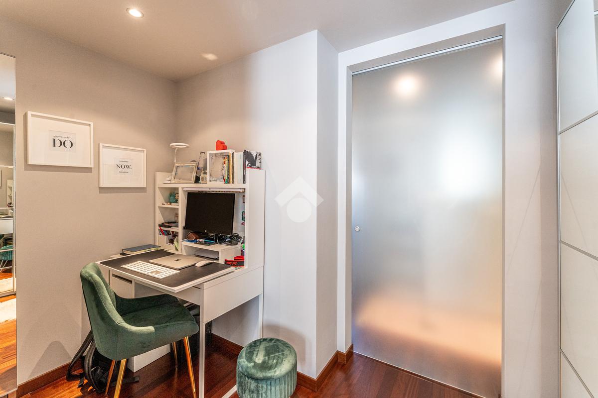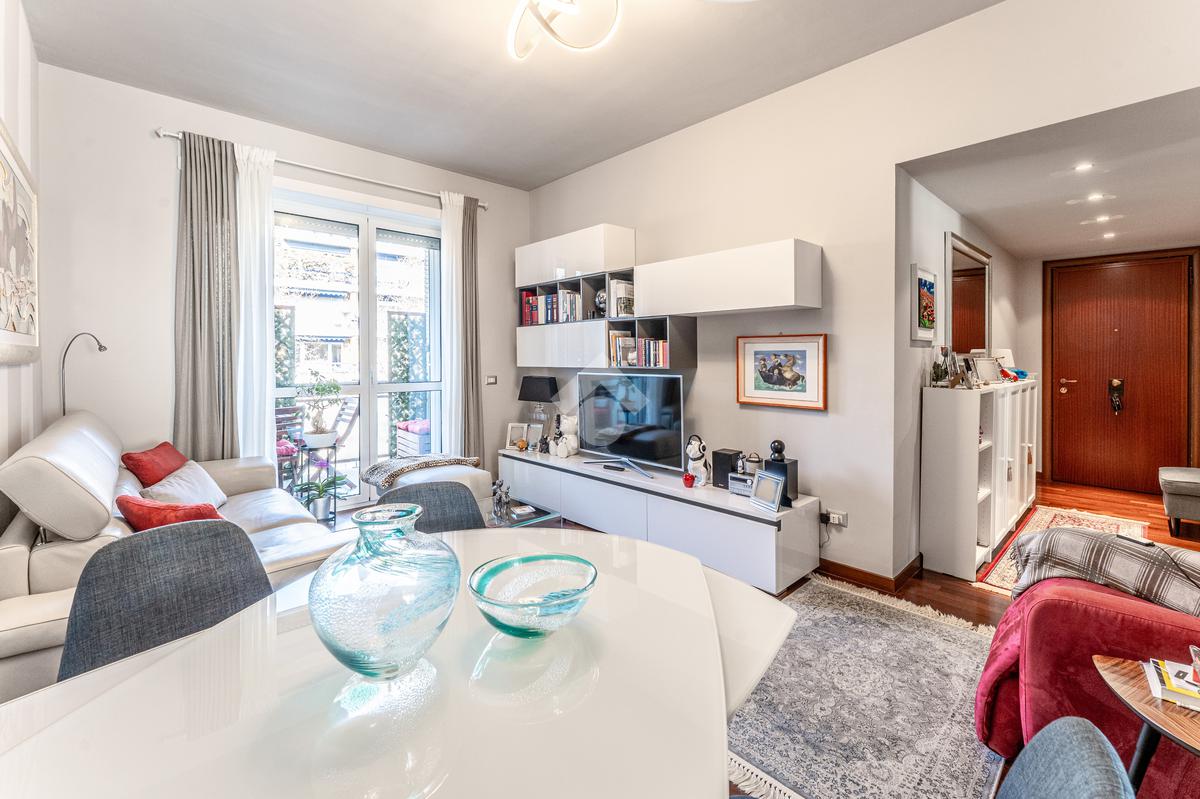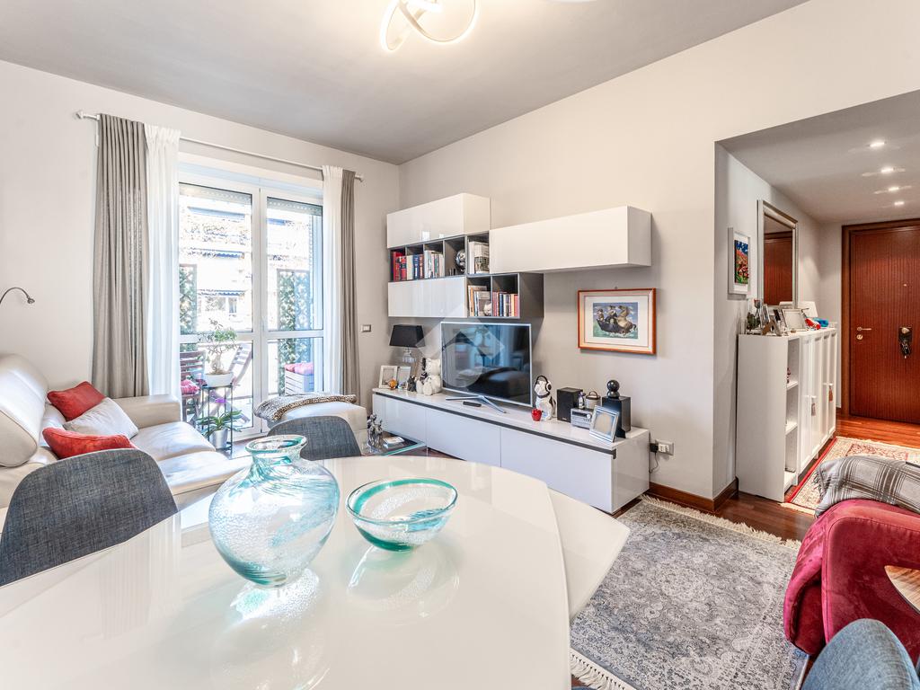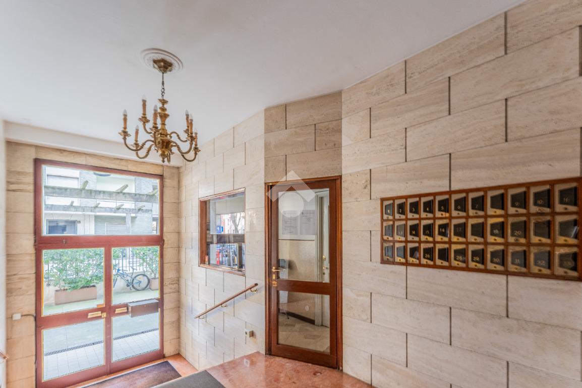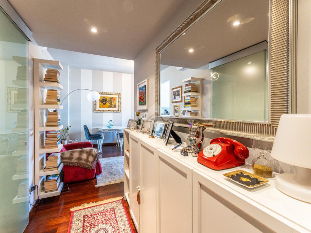 Lo stabile è dotato di servizio di portineria e doppio ascensore. Il riscaldamento è centralizzato a pavimento e l’appartamento è provvisto di aria condizionata in soggiorno e camera, assicurando comfort in ogni stagione.